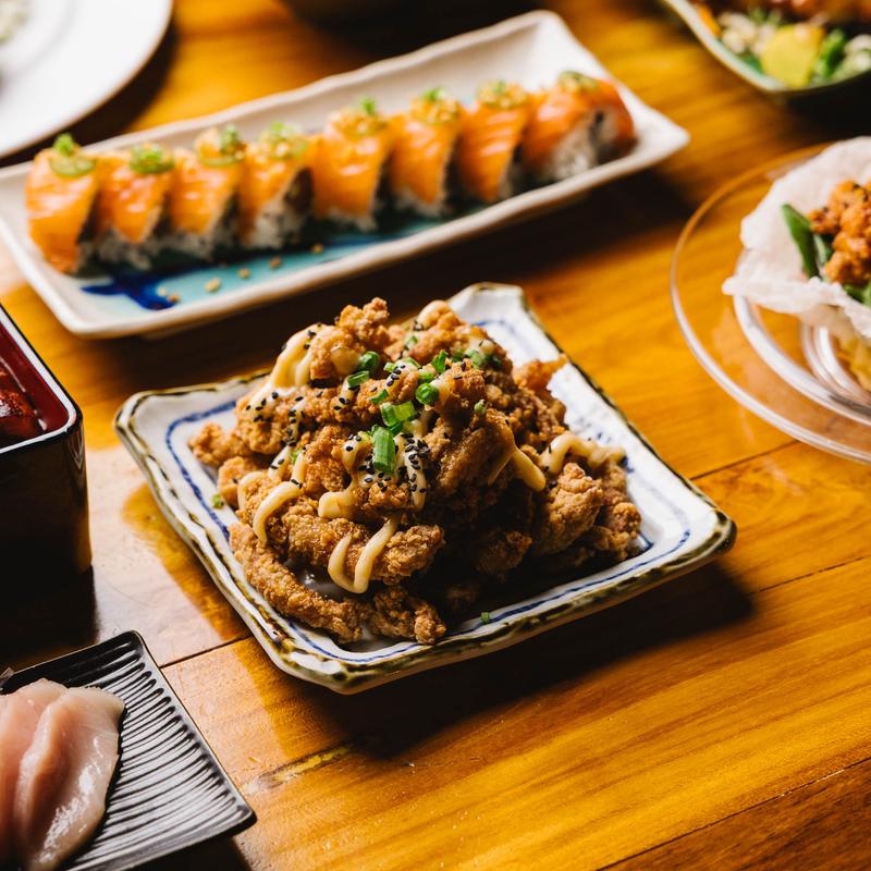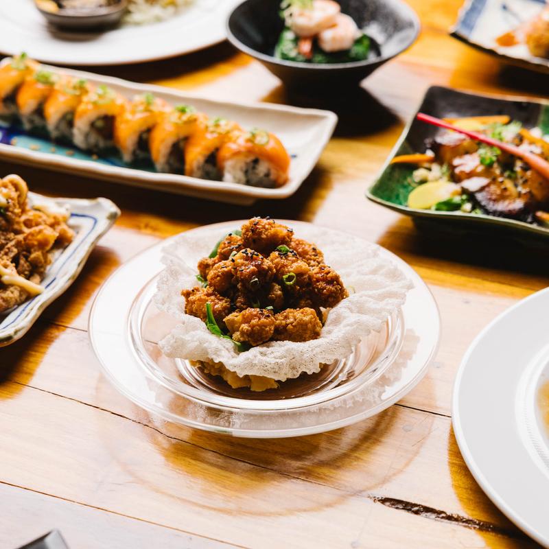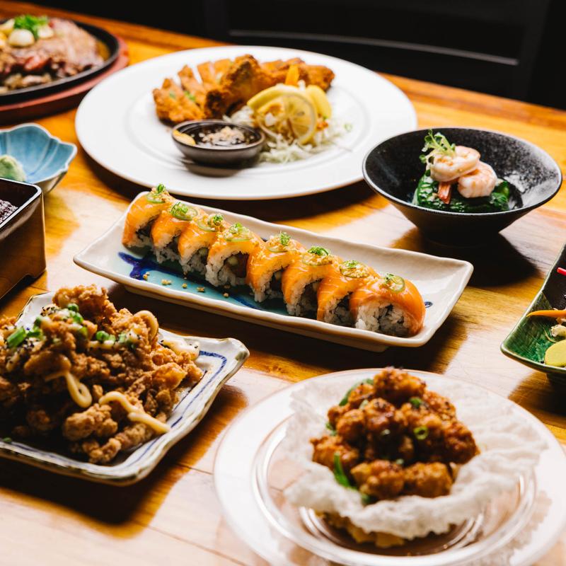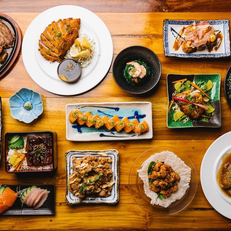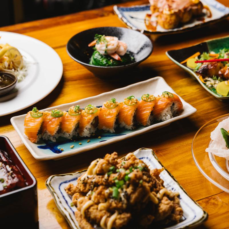 Tucked inside the Village, Mura feels like the neighborhood spot people hope to find when browsing South Kauaʻi restaurants. Lanterns glow against wood‑slat walls. Vintage prints and a kimono watch over lively tables. The bar shelves glint with sake, shochu, and whisky. Step in from the village walkway and the room settles into an easy rhythm, music low, voices warm, servers moving with unhurried grace.